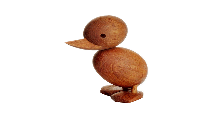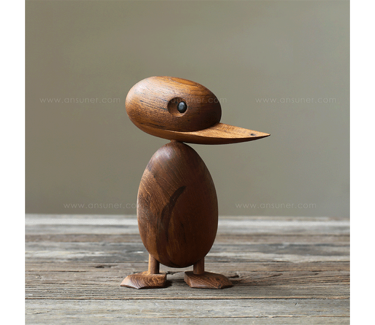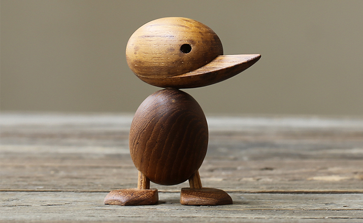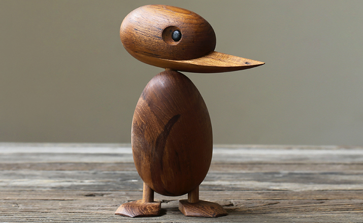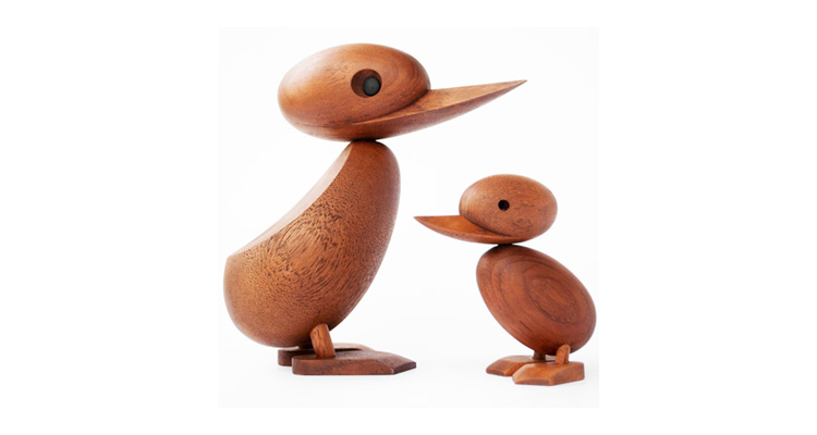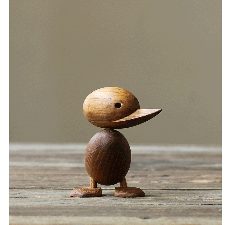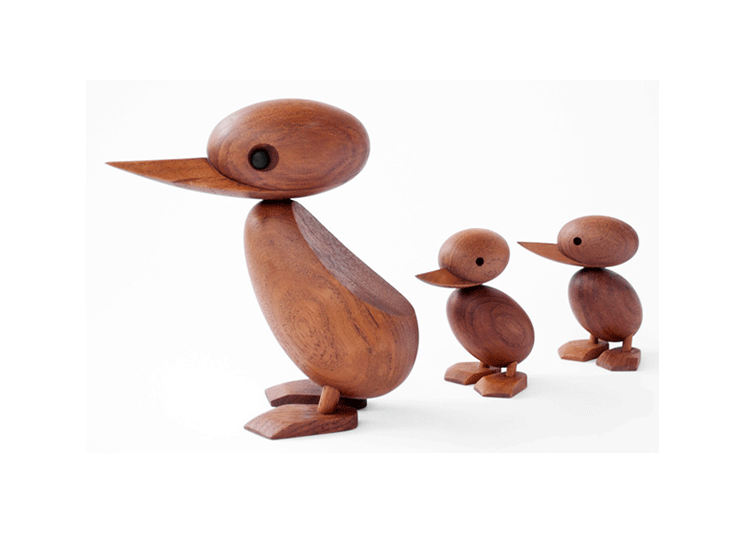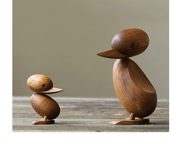Wooden Duck And Duckling(木鸭与小鸭子)的制作灵感来源于真实的故事,故事回到了1959年丹麦哥本哈根的春天场景。正当人们与自然万物自由的伸展苏醒时,某天,在Frederiksberg街头出现了春天出游的鸭妈妈正带领着一群呱呱叫的可爱小鸭过马路的画面,随后,出现了一位警察为牠们指挥交通并顺利的过了马路,隔天报纸就刊登出这幅景像并引起广大的回响。这看似不可思议的美好事件却反应出丹麦人珍惜呵护自然的天性,在与之共处的过程中总是细微观察并不断的上演着触动人心的情景。在那重视手工艺的黄金50年代,全球正掀起了一股「斯堪地那维亚现代主义设计」风潮,丹麦设计大师Hans Bølling为推手之一,他因为鸭子事件的报导而深受感动,因此设计了手工木鸭,作品中不但展现出简洁有机的线条并揉合了精湛的手工艺技法,且将主题延伸至人文社会环境的关怀,以独特的事件观点触动人心,而这正是「斯堪地那维亚现代主义设计」所要反应出的设计观点。这款1959年份出品的手工木鸭,虽经历了半个世纪之久后再度问市,却依然深得人心。当二十一世纪的人们开始了解到美好的生活似乎越来越像个神话,而地球上的物种灭绝的速度比科技发明来得快且无解时,出现了回归自然与环保的声浪,人们因此更懂得珍惜自然以及传统手工艺的经典设计,一种无法被工业化所取代的价值感与慰藉。