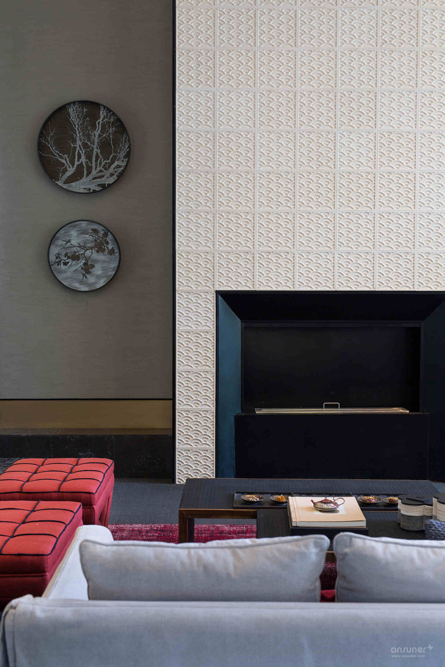 客厅:空间布局方正规整,用特别拘谨方整的艺术形式、刻线平整 、造型简单,以中国的“楷”,寻找中式艺术的“端正方整”,而粗犷的材质美把修饰降到最低,也回归到了最本质的自由。