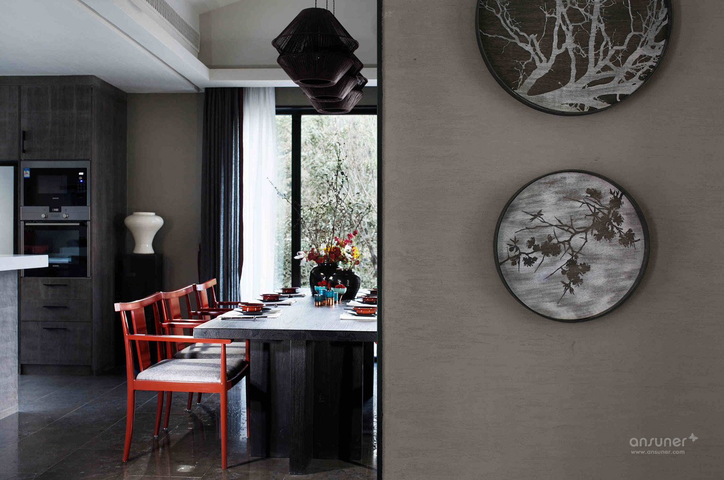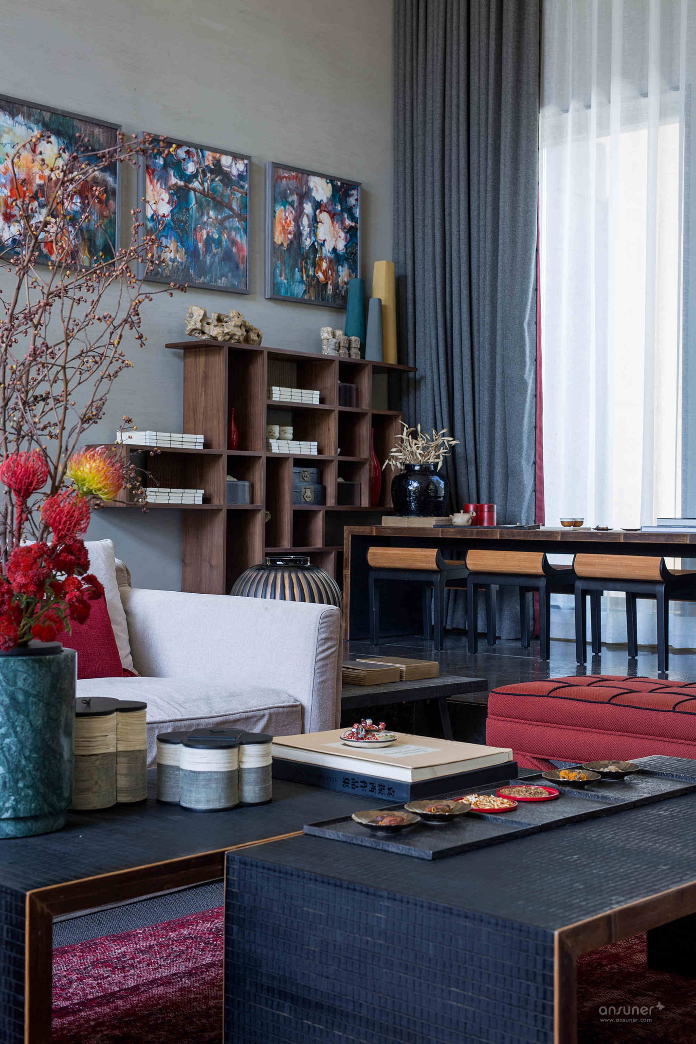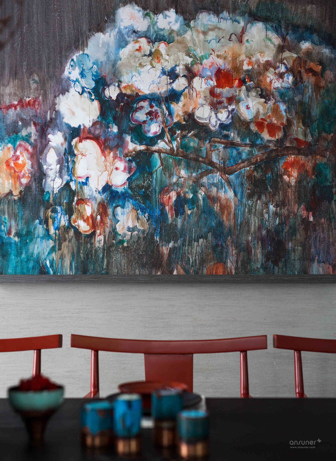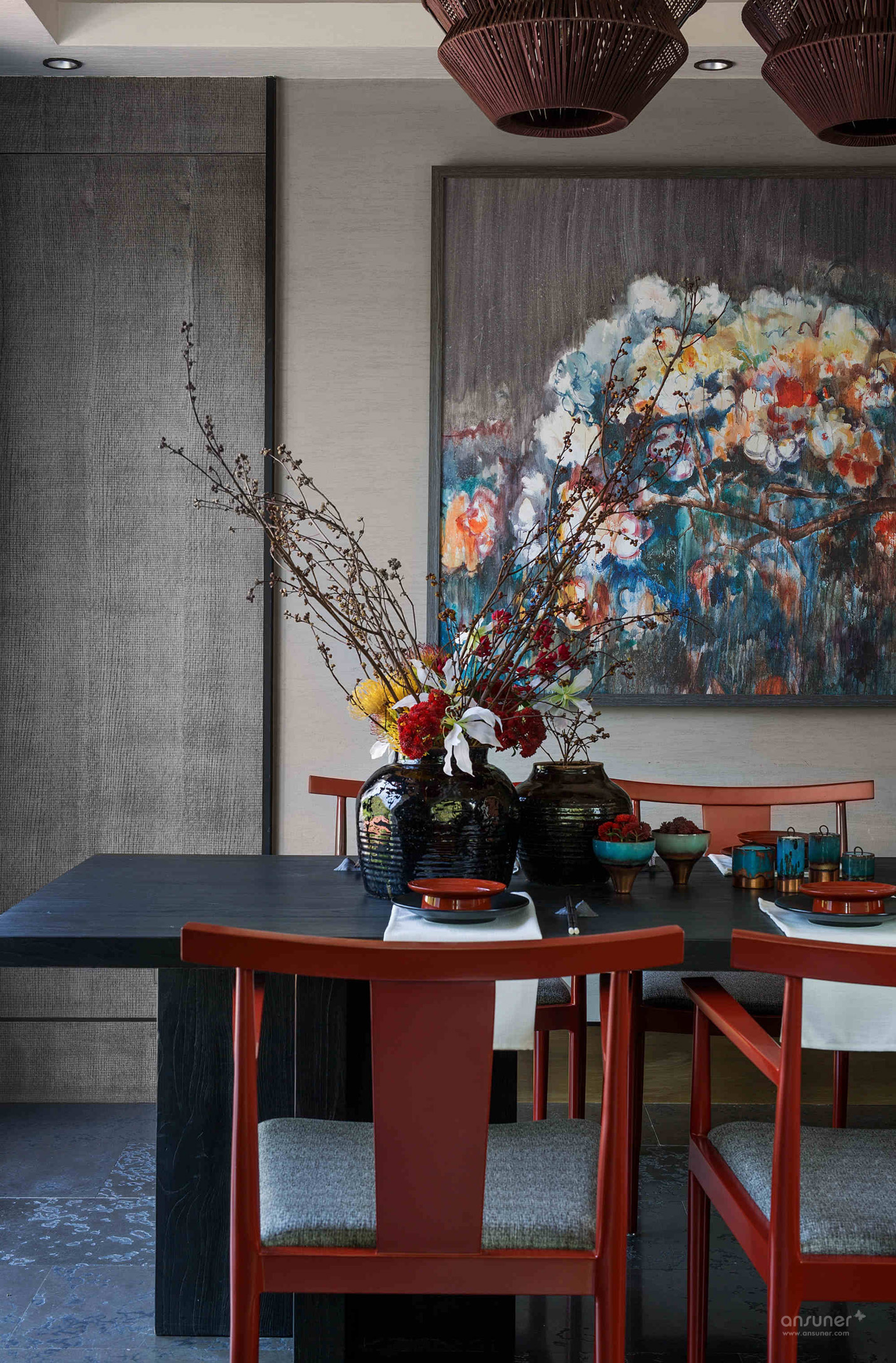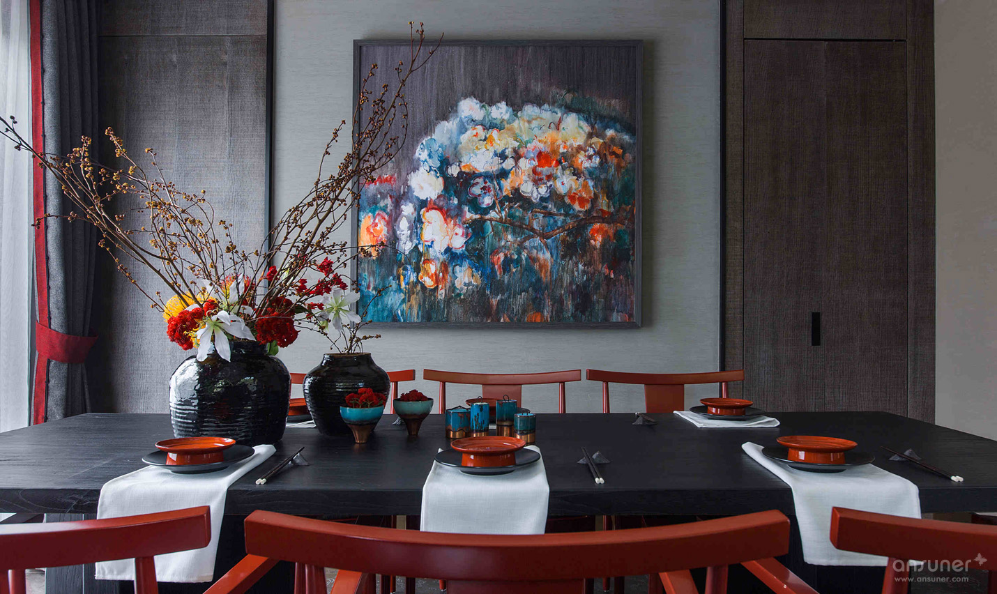 餐厅:餐厅延续了客厅的设计格调,捕获繁华绚烂中的一片宁静详和。青黑色的木桌、朱砂红的木制座椅、黑釉陶罐花樽,设计师运用意象叠加的手法,烘托出就餐区源自古老的韵味和踏实的生活情调。来自青年艺术家王志新的《花团锦簇》,极具张力的色彩与整个空间浑然一体。