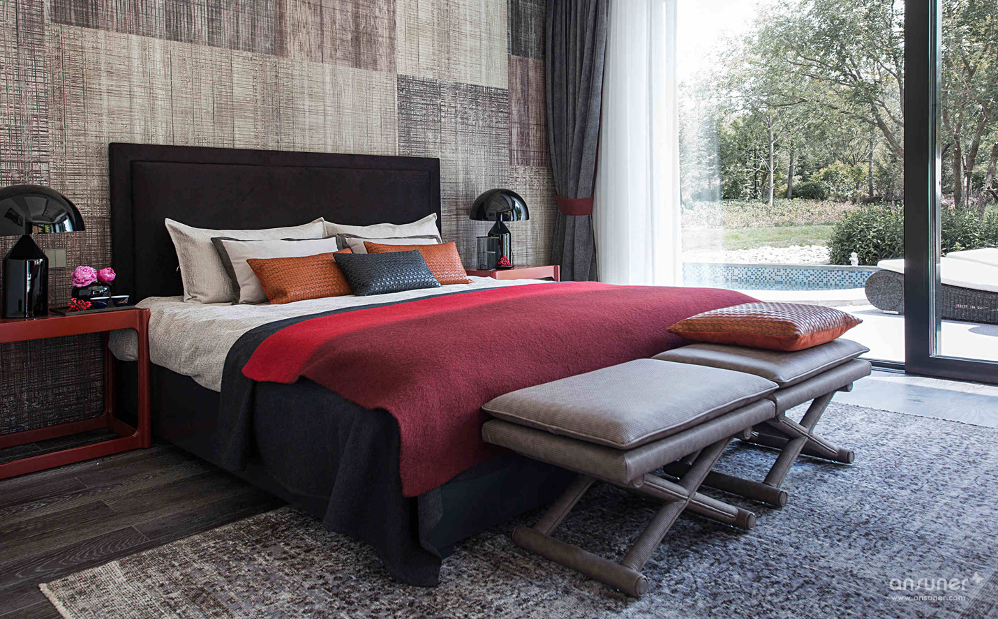 主卧:主卧设计将粗麻原始的肌理感运用到极致,以呈现安稳的时光。床头的背景墙带有棉麻布的纹路和质感,相同色系的深浅调和,又赋予空间丰富的层次美感。正红色的上漆床头柜,点燃中国风的明艳魅力。