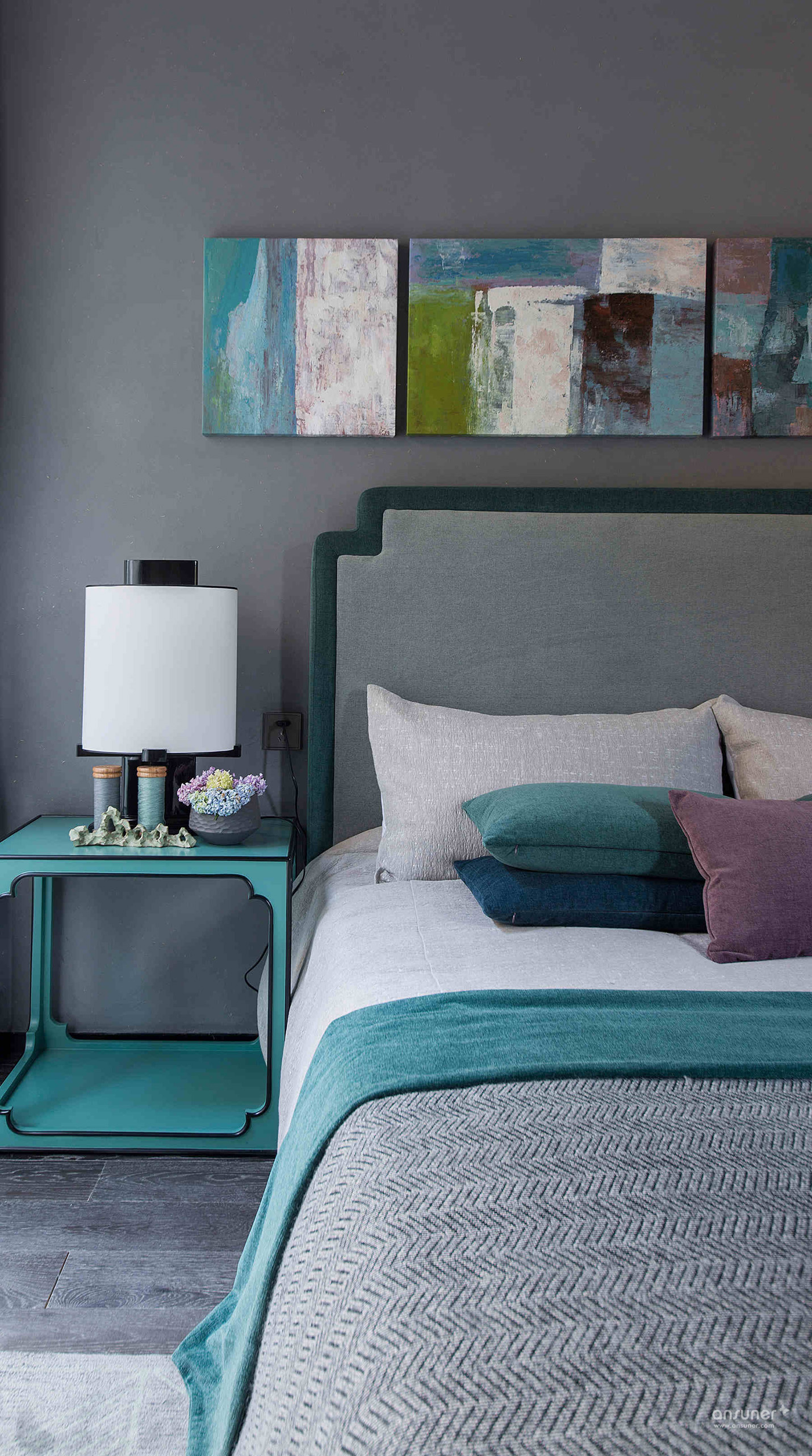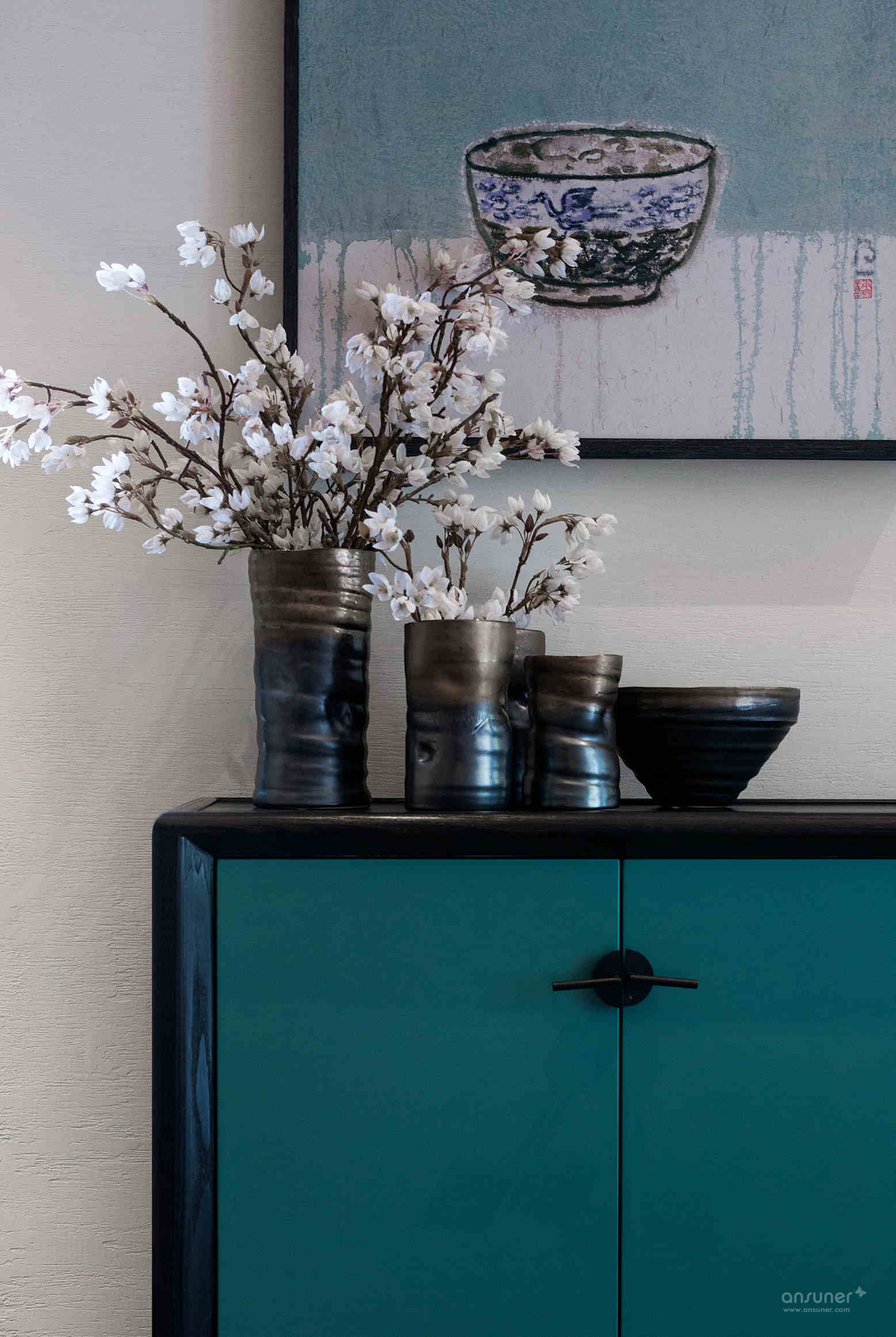 次卧:次卧呈现出一种清雅的中国美。清新别致的孔雀蓝为主调,搭配简约的新中式家具,做旧的铜质花钵稍显笨拙,置入花朵却焕发生机。组合油画与整体空间相谐相融,草草几笔,混沌中自有乾坤。